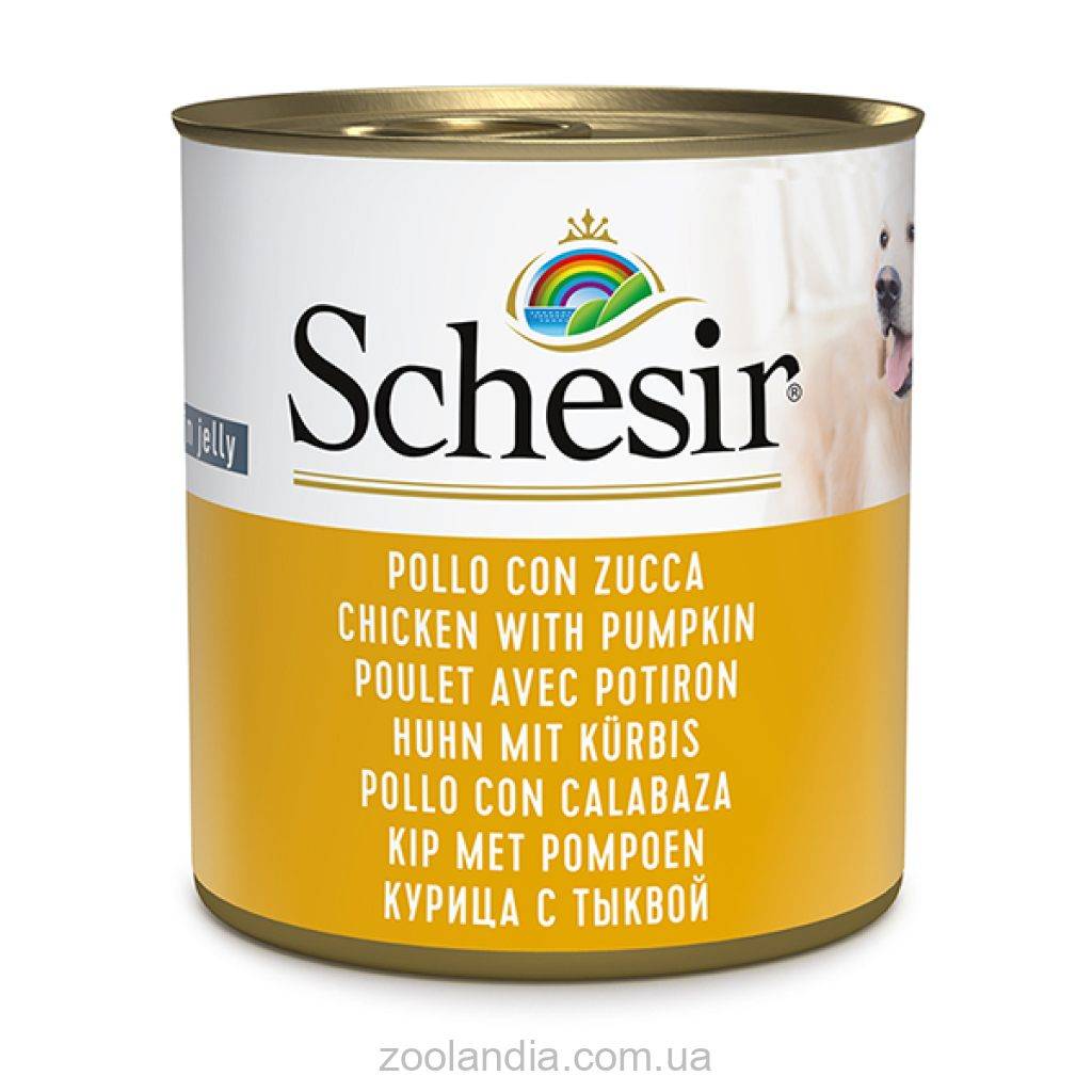 Влажный корм Schesir Chicken With Pumpkin можно использовать как вкусное дополнение к основному рациону собак, или как замечательное угощение, которым можно порадовать питомца в особых случаях. Консервы рекомендуются для взрослых собак всех пород возрастом от 1 года и старше.