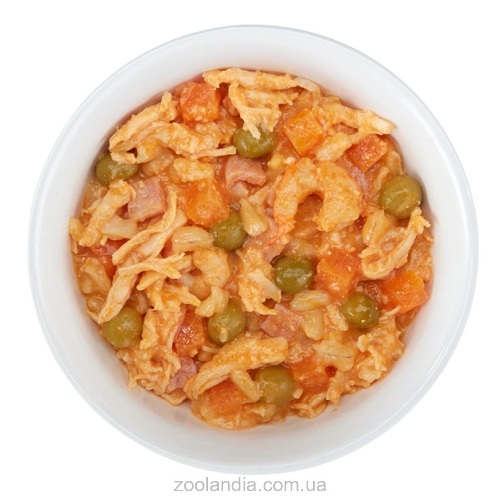 В основе рецепта – нежное куриное филе, составляющее 37% блюда, тушеное в собственном бульоне для сохранения всех питательных веществ. Каждая составляющая консервов подобрана с учетом не только вкуса, но и пользы: коричневый рис обеспечивает здоровые углеводы и клетчатку, креветки добавляют нотку морской свежести и богаты Омега-3 жирными кислотами, а ветчина и овощи, морковь и горох, дополняют блюдо важными минералами и витаминами. Текстура бульона, обогащенного рафинированным подсолнечным маслом и маслом тунца, делает этот корм не только полезным, но и невероятно аппетитным. Крахмал тапиоки придает блюду кремовость, а порошок куркумы – яркий и аппетитный цвет.