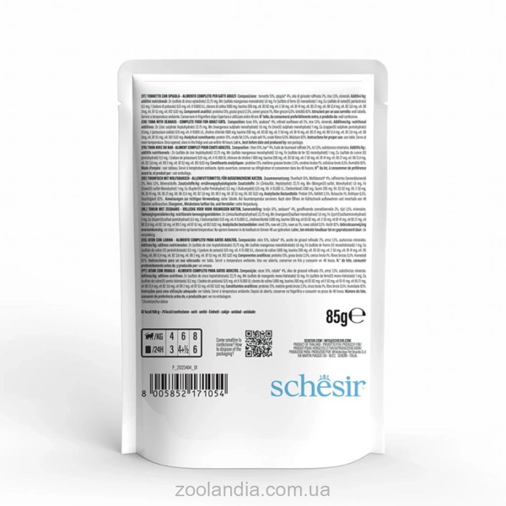 Консервы Schesir Тунец с Окунем в желе входят в линейку Complete Nutrition — серию полнорационных влажных кормов, разработанных при участии ветеринарных специалистов. Каждая рецептура обеспечивает кошке всё необходимое для сбалансированного рациона и помогает владельцу быть уверенным, что его питомец получает качественное и вкусное питание.