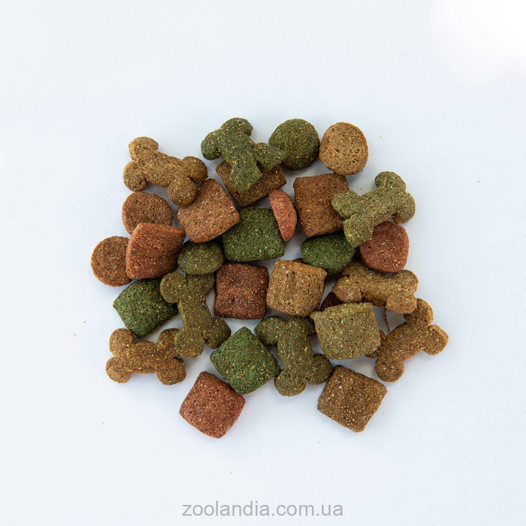 Состав: крупы и производные растительного происхождения, мясо и продукты животного происхождения 18% (в том числе говядина не менее 4%), растительные масла и жиры, витамины и минералы, овощи (0,3% сушеных овощей, что равно 4% овощей в цветных гранулах).