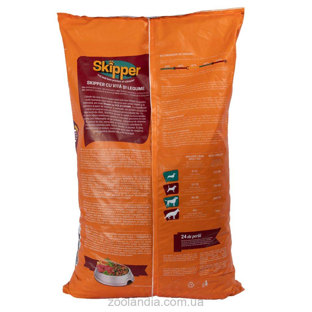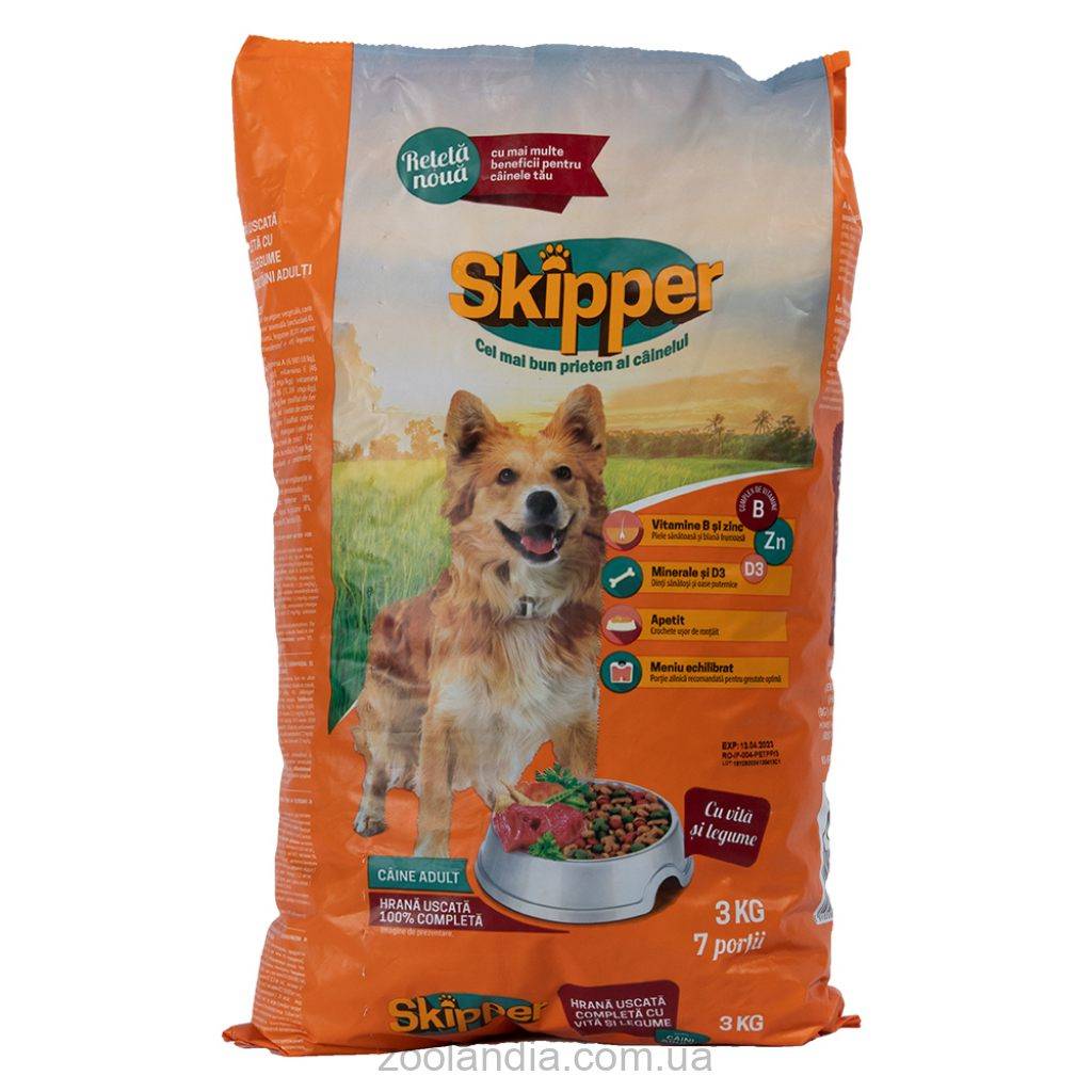 Сбалансированный состав корма способствует прекрасному виду шерсти, здоровью кожи, крепости зубов и костей.Все важное для здоровья вашей собаки содержит корм «SKIPPER с говядиной и овощами».