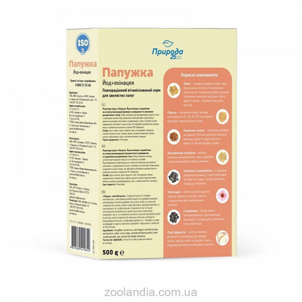 Рецептура корма « Папужка « Йод+Эхинацея » разработана на основе рекомендаций ведущих специалистов по разведению и содержанию декоративных птиц. Набор зерновых культур соответствует рациону птиц в естественных условиях.
