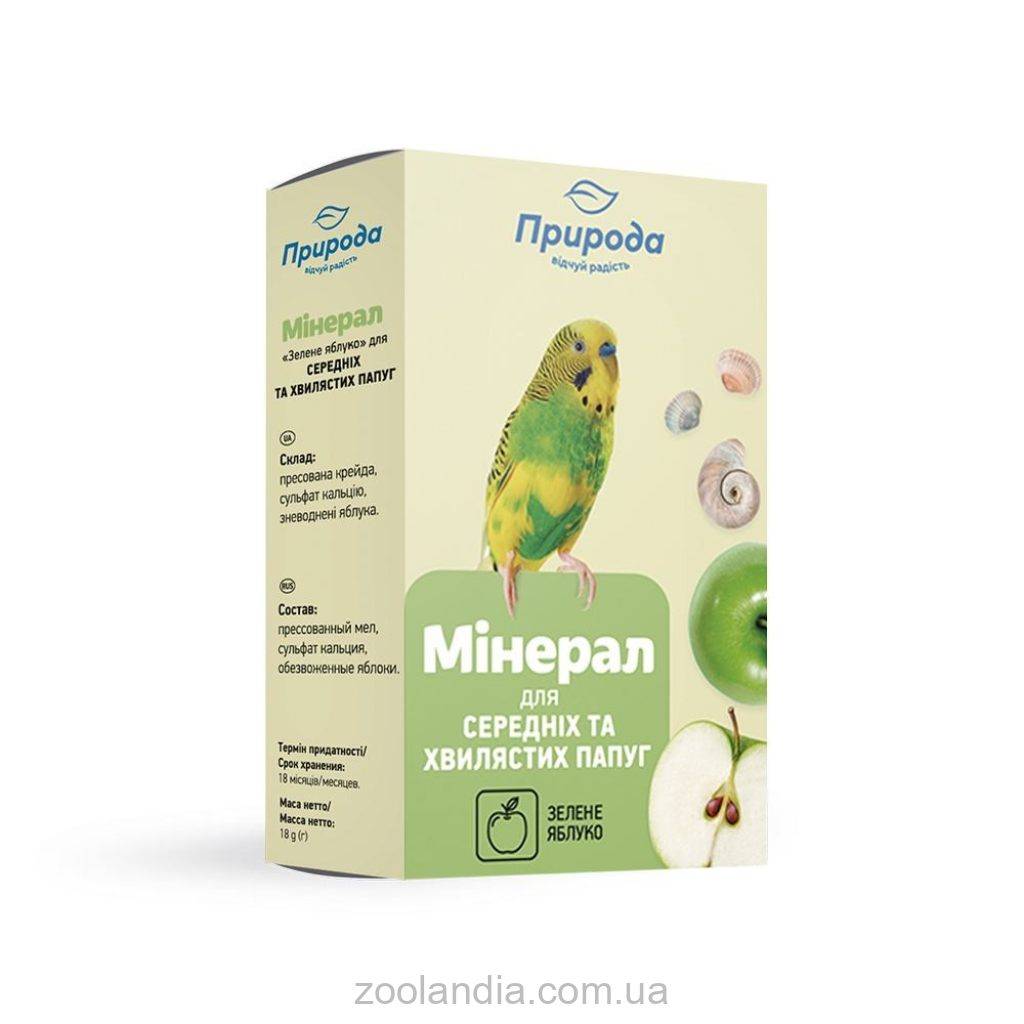Мел и кальций необходимы для нормального развития птиц, формирования костей, перьев, яиц, а также для чистки и стачивания клюва. Обезвоженные кусочки яблок дополняют рацион углеводами, витаминами и пектиновыми веществами, а также стимулируют поедание минерала.