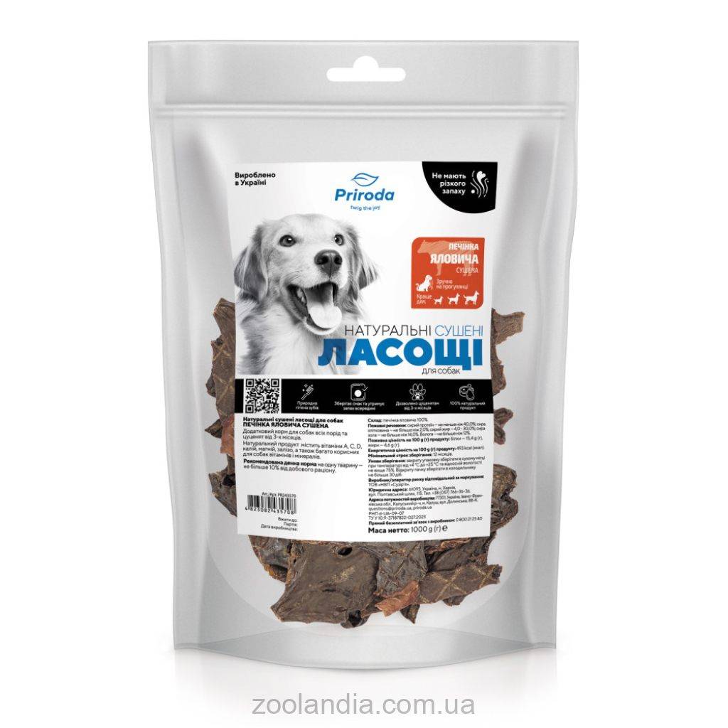 Печень говяжья – ценная добавка к ежедневному рациону собаки, поскольку содержит значительное количество витамина А, необходимого для формирования скелета, здоровья кожи, хорошего зрения, красивой яркой шерсти. Также в состав продукта входит немало витаминов и минералов: калий, магний, медь, железо. Они способствуют восстановлению тканей, улучшают работу сердца, нервной системы, повышают сопротивляемость организма к заболеваниям и улучшают кроветворение. Для приготовления вкусностей используется печень говяжья высочайшего качества, в которой сохранены вкус и полезные свойства. Чипсы из печени удобно использовать при дрессировке.