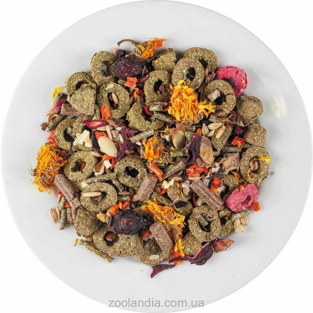 Уникальный корм включает отборные травы, витаминизированный комбикорм, семена и другие ингредиенты из природного ареала обитания кроликов. Рецептура гармонично объединила 20 ингредиентов, среди которых целебные травы, сушеные фрукты, овощи, а также редкие деликатесы - шиповник, гибискус, пастернак. Корм включает полезный протеиновый-минеральный гранулят, который улучшает общее состояние здоровья, способствует укреплению зубов и костей, улучшению состояния меха.