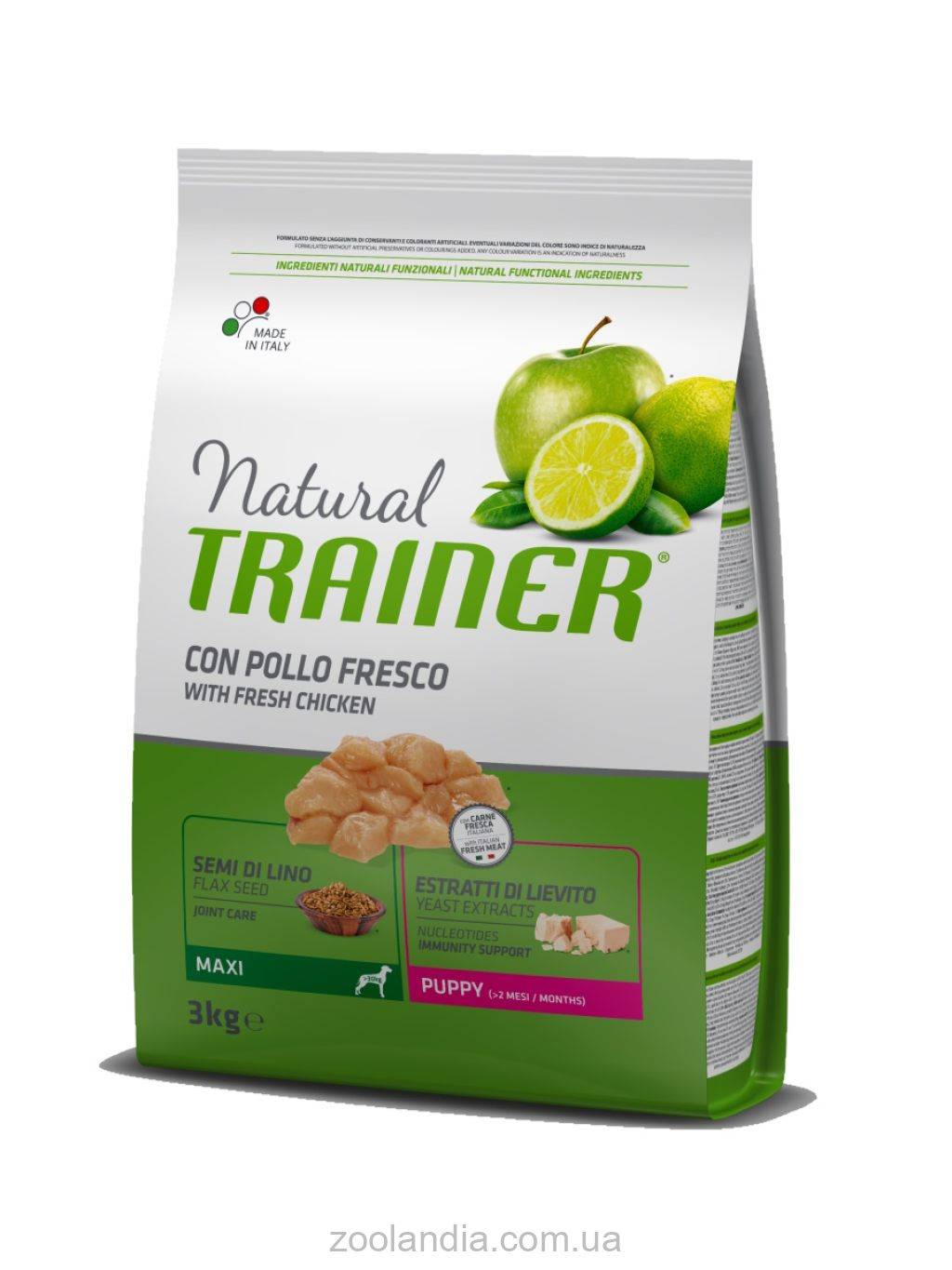 Natural Trainer – это полноценный и сбалансированный корм категории холистик для щенков больших пород. Содержит ингредиенты, которые поддерживают и защищают организм питомца. Фрукты содержат антиоксиданты природного происхождения. Процианидин из яблочного экстракта стимулирует рост шерсти, очищает зубы и в сочетании с морскими водорослями делает естественный цвет шерсти более насыщенным. Уникальное сочетание растительной клетчатки спирулины улучшает пищеварение, а также оказывает антиоксидантный и противовоспалительный эффект.