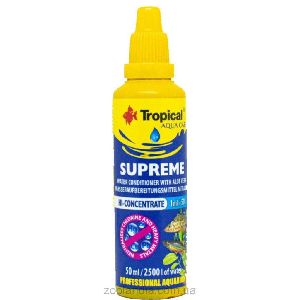 Tropical Supreme с алоэ вера — эффективное средство для быстрого улучшения качества пресной воды в аквариумах. Оно быстро устраняет хлор и тяжелые металлы, предохраняя рыбок от вредных веществ. Экстракт алоэ успокаивает рыб и способствует быстрому восстановлению их кожи. Supreme начинает работать сразу после добавления в воду, что идеально для срочных замен.
