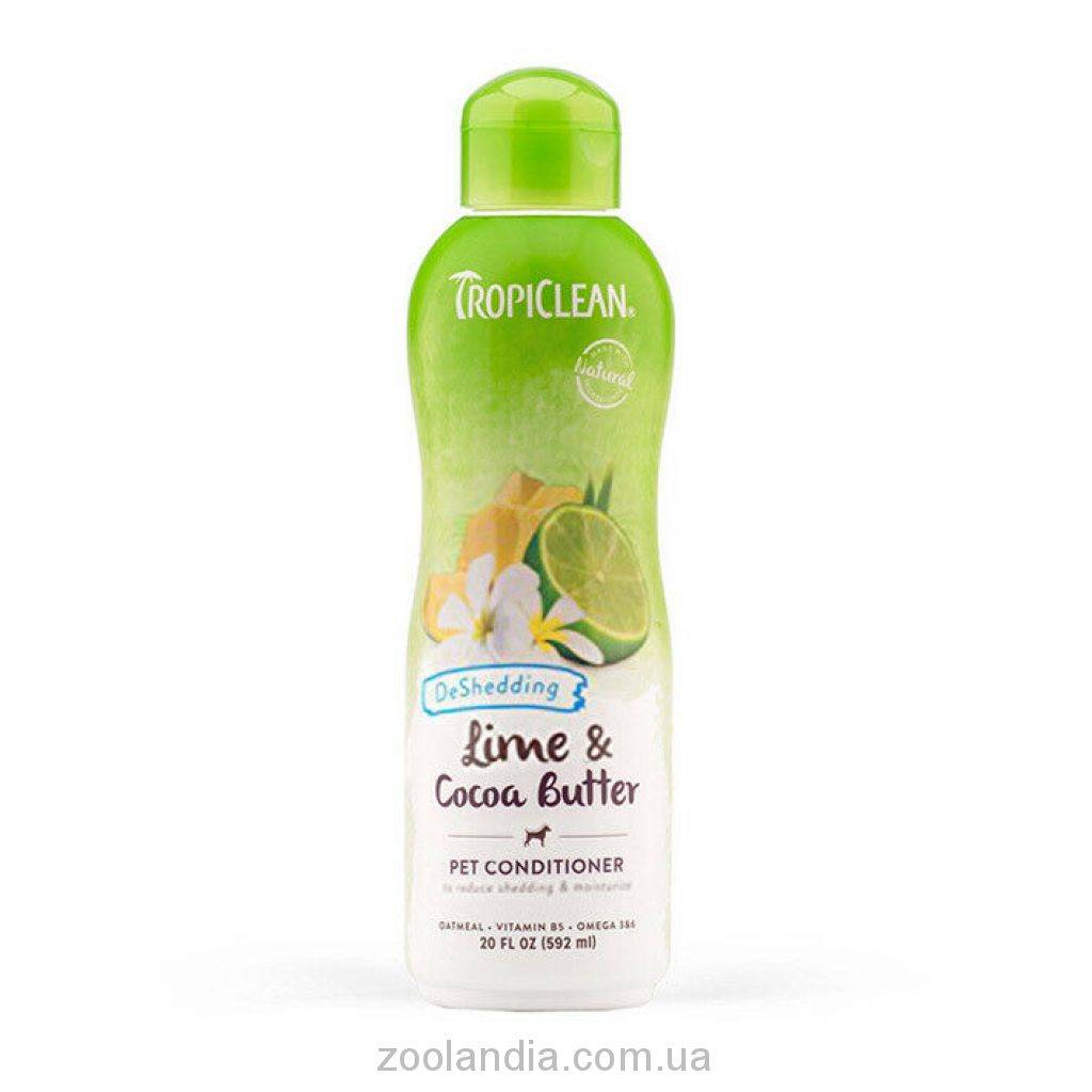 Содержит Омега 3 и6 жирные кислоты эффективно питают кожу, уменьшая выпадение и устраняя спутывание шерсти животных. Содержащиеся в формуле лайм и масло какао восстанавливают естественный водный баланс кожи вашего питомца и облегчают прохождение линьки.