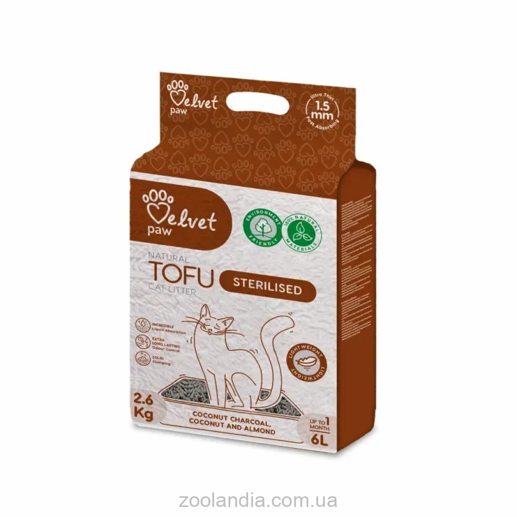 Наполнитель для кошачьих туалетов VELVET PAW TOFU для стерилизованных кошек с кокосовым углем, миндальной и кокосовой эссенцией изготовлен из 100% натурального горохового волокна, не содержит никаких синтетических добавок или красителей. Наполнитель быстро впитывает влагу, нейтрализует неприятные запахи и чрезвычайно бережно относится к чувствительным лапкам вашей кошки.