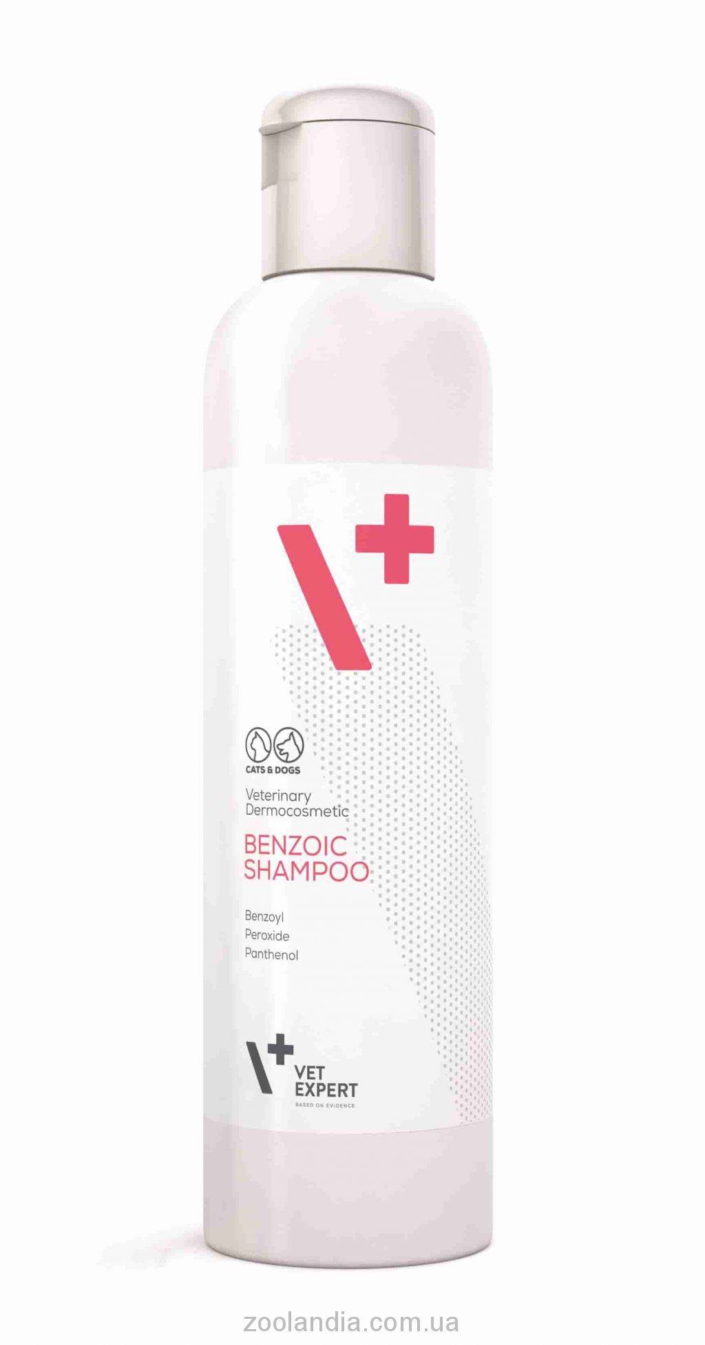 VetExpert Benzoic Shampoo - дерматологический шампунь для животных, имеющих жирную кожу и шерсть. Шампунь содержит бензоил пероксид, который оказывает антисеборейное и антибактериальное действие на кожу. Бензоил пероксид является также эффективным, но мягким антисептиком-эксфолиантом, который не только защищает от бактерий, но и удаляет омертвевшие клетки кожного покрова, что помогает появлению новых клеток, очищает поры, активизирует процессы кровообращения и улучшает снабжение тканей кислородом. Происходит процесс восстановления кожи, во время которого она приобретает гладкость и здоровый вид.