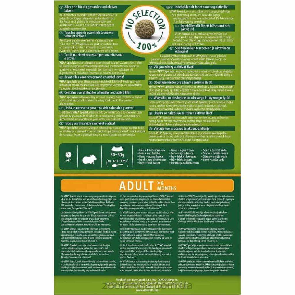Полнорационный корм для морских свинок VITA® Special содержит все необходимые питательные вещества в одной грануле, исключая выборочное поедание, и идеально подходит для привередливых животных. Корм содержит жизненно необходимые питательные вещества в оптимальном количестве и удовлетворяет все потребности взрослых морских свинок. Сырая клетчатка, которая входит в состав Vita® Special, улучшает пищеварение и способствует стачиванию зубов.