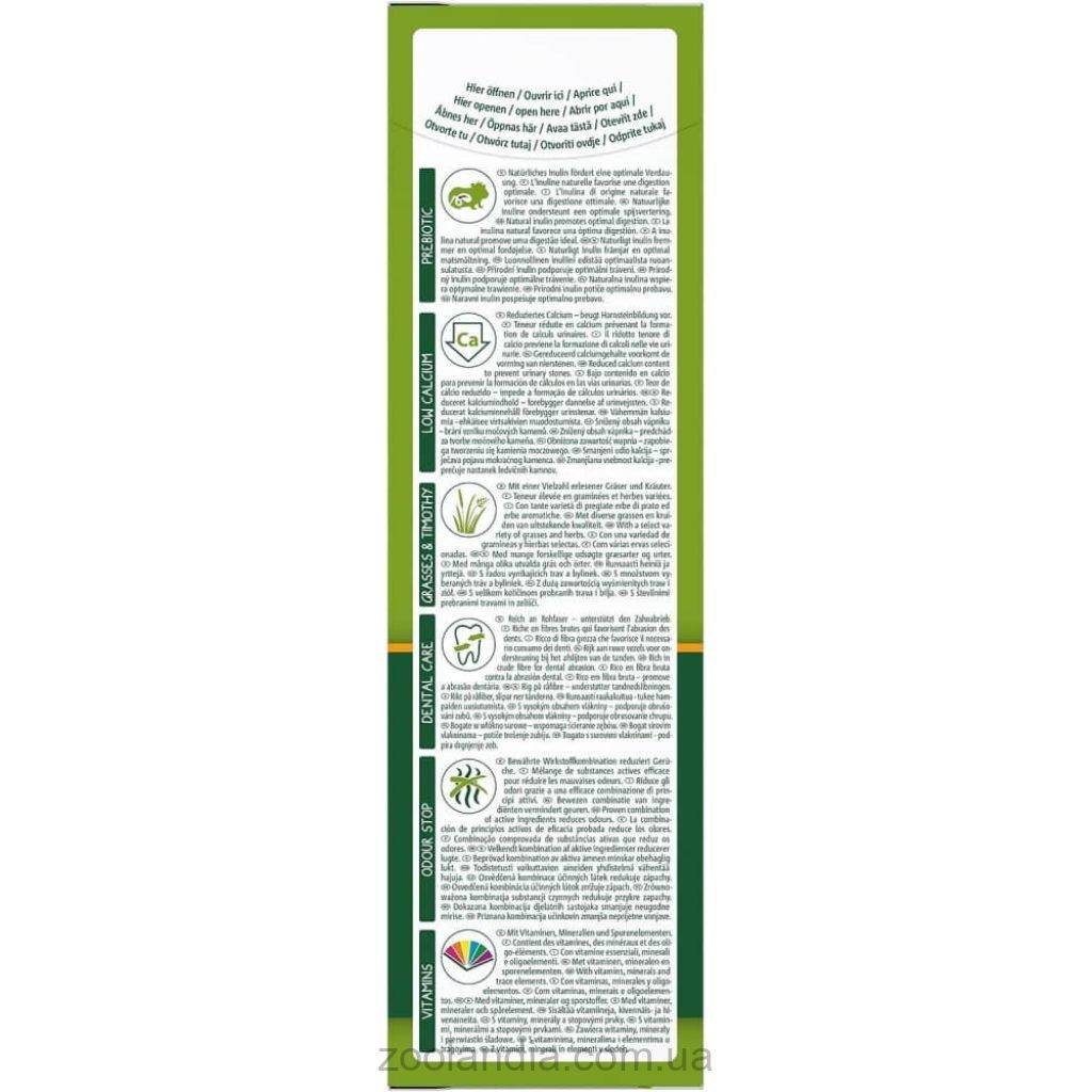 Cостав: Продукты растительного происхождения (тимофеевка луговая 10%), овощи, злаки (кукуруза 10%), инулин - 2.1%, масла и жиры (рапсовое масло 1%), минералы, экстракт юкки Шидигера, кальций - 0.70%, фосфор - 0.40%, сырая клетчатка - 20%.