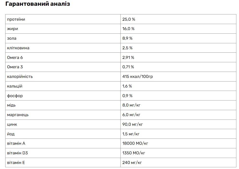 Ягня (борошно з м'яса ягняти 29%, свіже ягня5%), рис 26%, кукурудза, очищена куряча олія, бурякова пульпа, курячий дігест, криль, дріжджі, цільне насіння льону, мінерали, пребіотик ФОС, пребіотик МОС, екстракт юкки, глюкозамін, МСМ, хондроїтин, журавлина, нуклеотиди. Антиоксиданти (розмарин та натуральні екстракти, збагачені токоферолом).