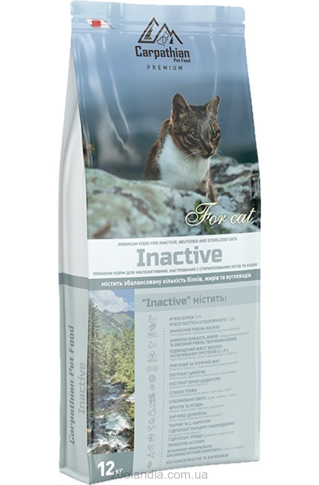 Сухий корм Carpathian Pet Food Inactive має підвищений вміст вітамінів: А, Е, групи В. Компоненти корму зі збільшеною кількістю клітковини покращують функції кишечника, підвищують рівень травлення та запобігають виникненню запорів. Вміст цинку дає позитивний вплив на шкіру та шерсть. Знижений рівень магнію (Mg) запобігає виникненню сечокам'яної хвороби. Тільки повноцінне харчування для малоактивних, кастрованих та стерилізованих котів та кішок здатне забезпечити нормальну життєдіяльність вашого улюбленця.
