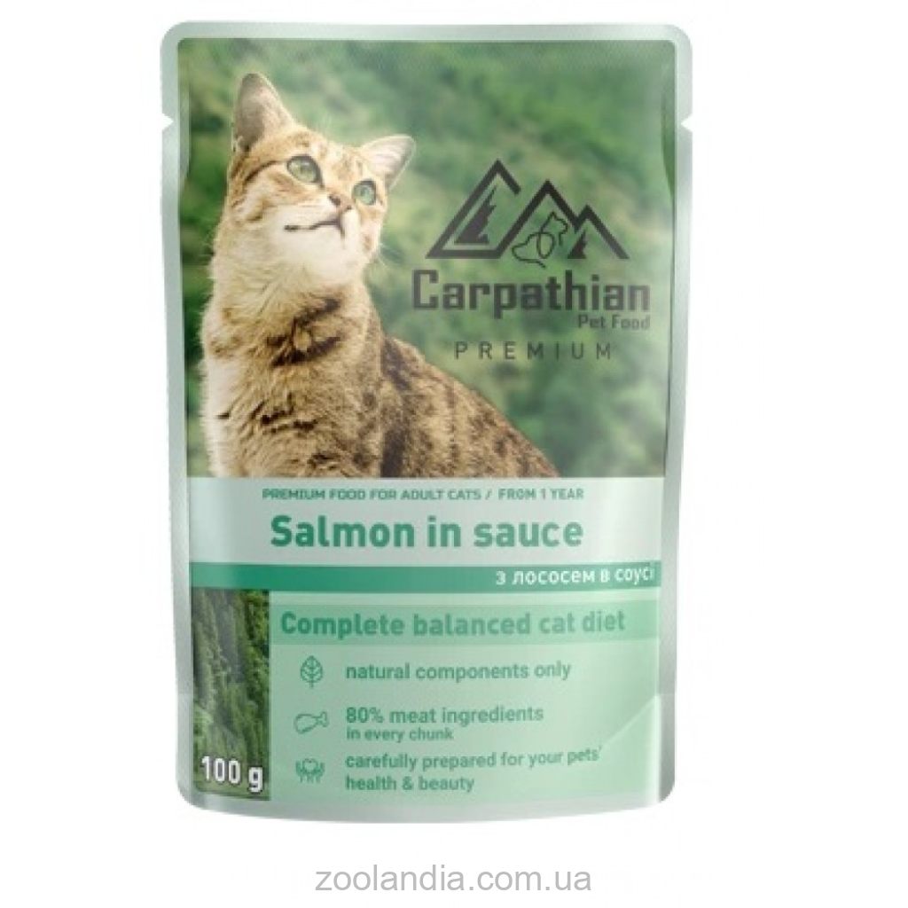 Вологий корм преміум класу від ТМ Carpathian Pet Food «Salmon in sauсe» Лосось в соусі для дорослих кішок безумовно забезпечить нормальну життєдіяльність Вашого улюбленця.