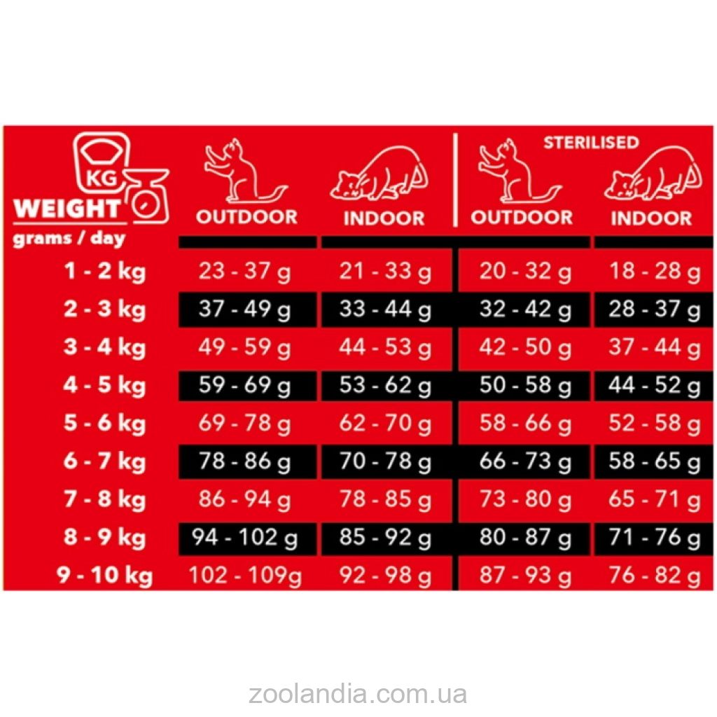 Рекомендовані добові норми годування для дорослих і стерилізованих котів наведені в таблиці. Ці норми є на кожному пакунку товару.