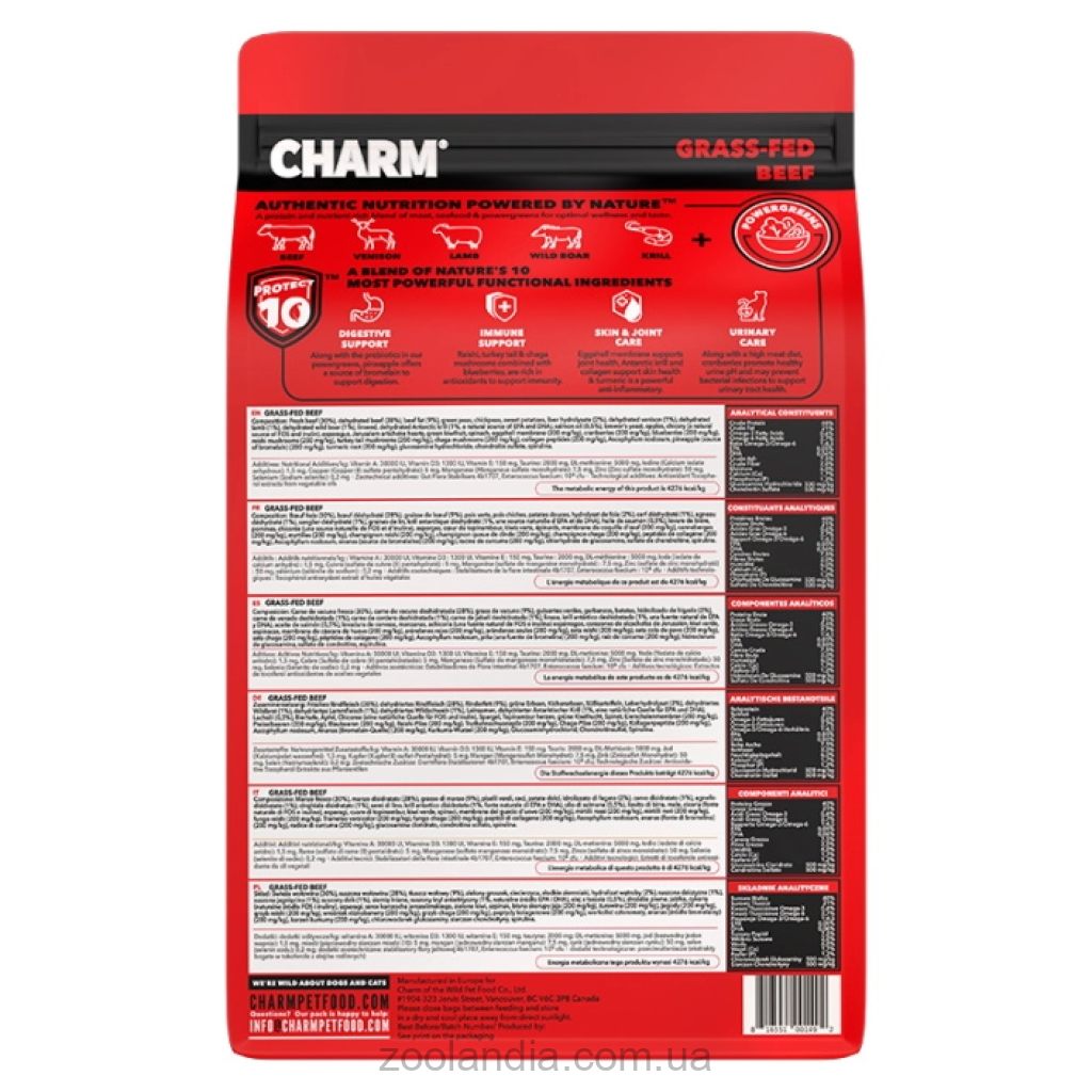 Сухий беззерновий холістик корм Charm Grass-Fed Beef – справжнє автентичне харчування, створене спеціально для хижаків, якими в душі залишаються всі домашні коти, чи то домосіди, які надають перевагу затишку, чи то коти-дослідники, яких захоплюють пригоди на вулиці. В основі формули – гармонійне поєднання м’яса яловичини та різних видів дичини, яке ідеально доповнене морепродуктами та натуральними інгредієнтами, ретельно відібраними для створення оптимального балансу поживних речовин. Цей повноцінний раціон натхненний природою і підкріплений науковим досвідом. Він орієнтований на біологічні потреби котів, відповідає їхнім природним інстинктам, дає змогу їм залишатися у чудовій формі, зберігаючи активність і здоров’я на кожному етапі життя.