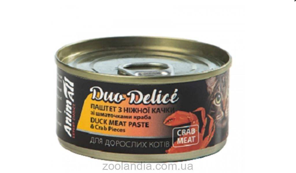 AnimAll Duo Delice Duck Meat Paste - вологий корм для кішок є ніжним поєднанням високоякісного м'яса качки і шматочків натурального краба. Він розроблений, щоб задовольнити навіть найвибагливіших кішечок із вишуканим смаком.
