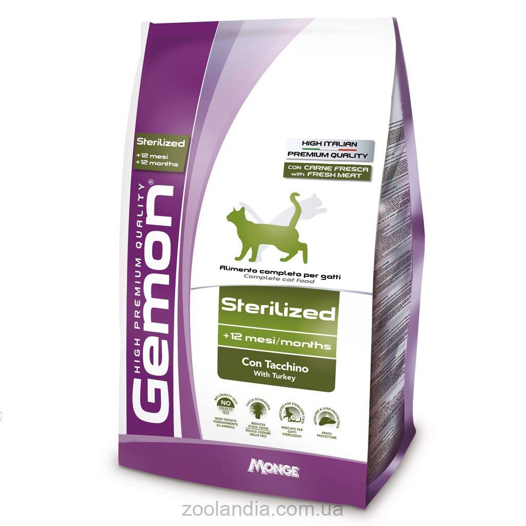 Тільки високоякісні натуральні інгредієнти, контроль усіх етапів виробництва та відсутність ГМО роблять Gemon Sterilized with Turkey надійним та здоровим вибором для стерилізованих кішок.