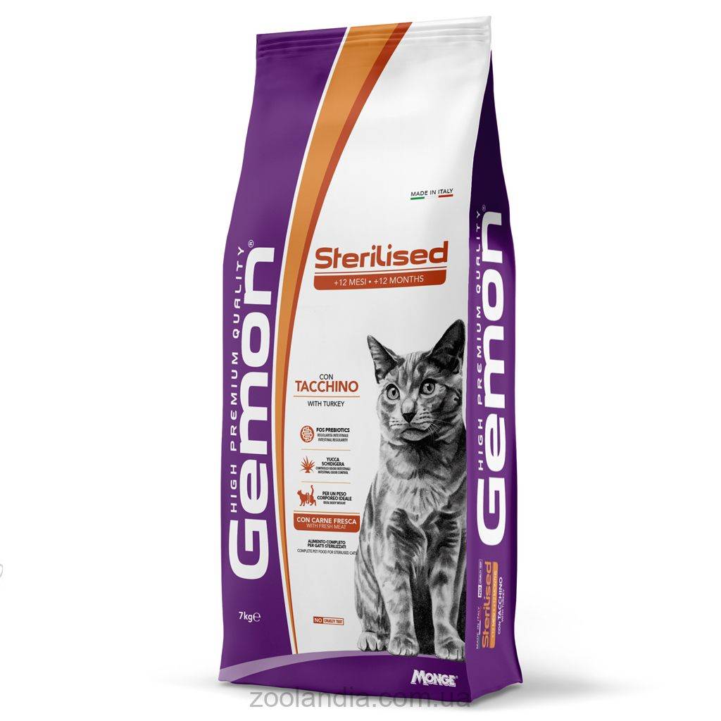 Gemon Sterilised with Turkey - це повноцінний корм, спеціально створений для стерилізованих дорослих кішок. Рецептура виробу вражає використанням інгредієнтів найвищої якості, таких як індичка, та джерел вуглеводів, таких як рис, які приготовані з використанням процесу екструзії для забезпечення високої засвоюваності.
