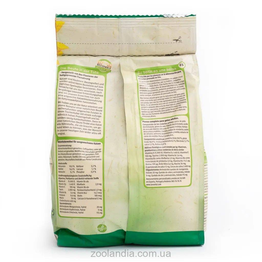Добавки (на 1 кг): вітамін – 15000 МО, вітамін D3 – 1440 МО, вітамін Е – 100 мг, таурин – 2000 мг, вітамін В1 – 3,6 мг, вітамін В2 (у вигляді рибофлавіну) – 2,9 мг, вітамін В6 (у вигляді гідрохлориду піридоксину) - 2,9 мг, вітамін В12 - 14,5 мкг, біотин - 100 мкг, фолієва кислота - 0,6 мг, ніацин - 36 мг, D-пантотенат кальцію - 12 мг, холінхлорид - 2600 мг.
