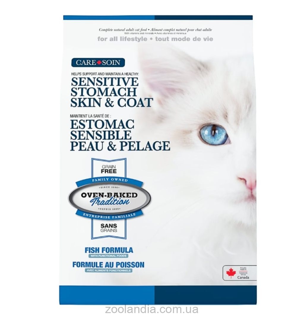 Oven-Baked Tradition Skin & Stomach – спеціально розроблена беззернова формула для котів, яка підтримує здорове травлення, імунітет та блискучу шерсть. Завдяки поєднанню функціональних інгредієнтів, вітамінів та мінералів, вона допомагає зменшити запалення кишечника (завдяки цеоліту), підтримує мікрофлору та імунну систему (завдяки постбіотикам), а також забезпечує сяючу шерсть та здорову шкіру завдяки свіжому оселедцю, лососю, омега-3, ДГК та вітаміну С.Справжня унікальність корму Oven-Baked Tradition – технологія повільного запікання у печі. Завдяки щадній термообробці при низьких температурах зберігаються всі поживні властивості інгредієнтів, природний аромат та смак. Корм готується невеликими партіями – як домашня їжа, яку ви приготували з любов'ю.
