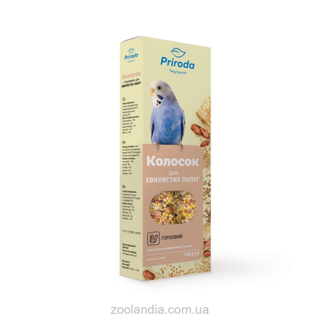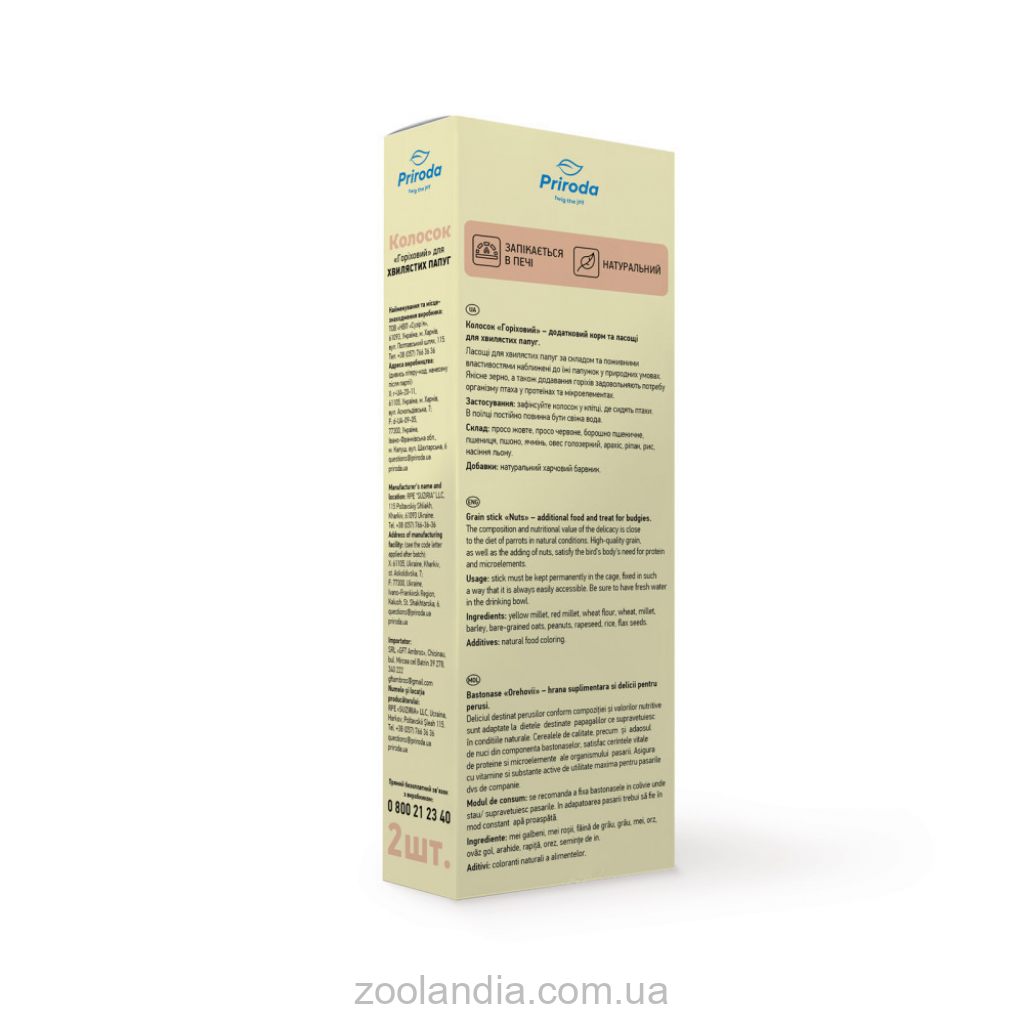 Повноцінні вітамінізовані ласощі мають високу поживну цінність і смакові якості завдяки спеціальній технології обробки інгредієнтів. Склад колосків наближений до їжі папуг в природних умовах. Добірні зерна забезпечують птахів енергією.