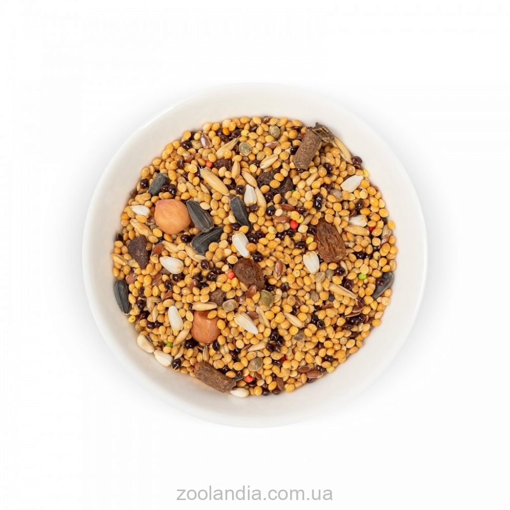Склад: виноград сушений, канаркове насіння, насіння конопель, насіння льону, арахіс, насіння соняшнику, яблука сушені гранульовані, просо чорне, овес голозерний, кероб, сафлор, просо, сорго, пшоно