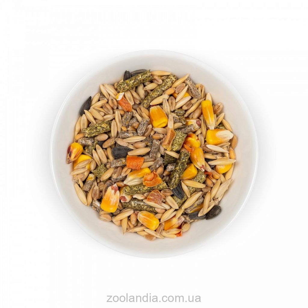 Склад: пшениця, трав’яне борошно гранульоване в асортименті, кукурудза, овес, комбікорм, сушена морква, насіння соняшнику, яблука сушені гранульовані.