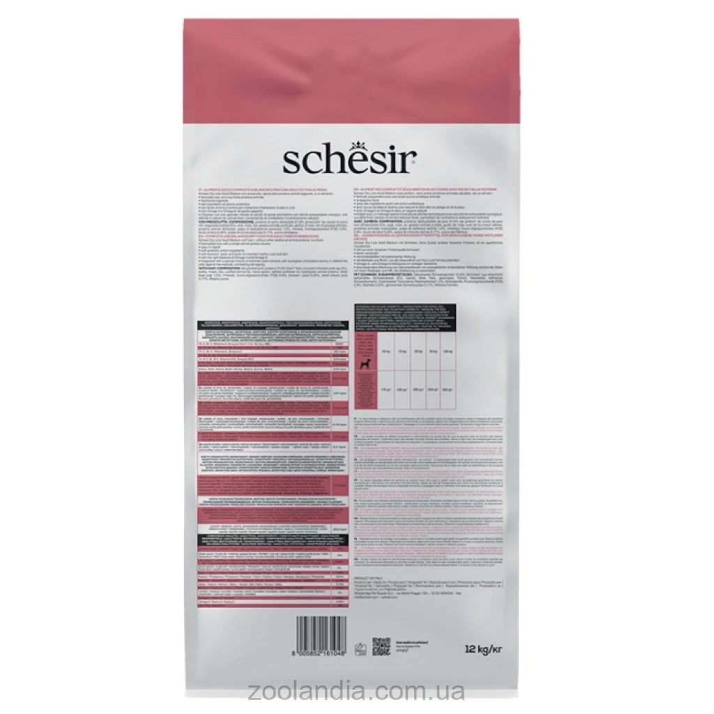 Schesir Medium Adult Ham – повноцінний збалансований раціон для собак середніх порід, що складається з натуральних інгредієнтів із додаванням комплексу вітамінів і мінералів, потрібних для здоров’я та довголіття вашого улюбленця. З високим вмістом свинини без додавання інших джерел тваринного білка – монопротеїнова формула.