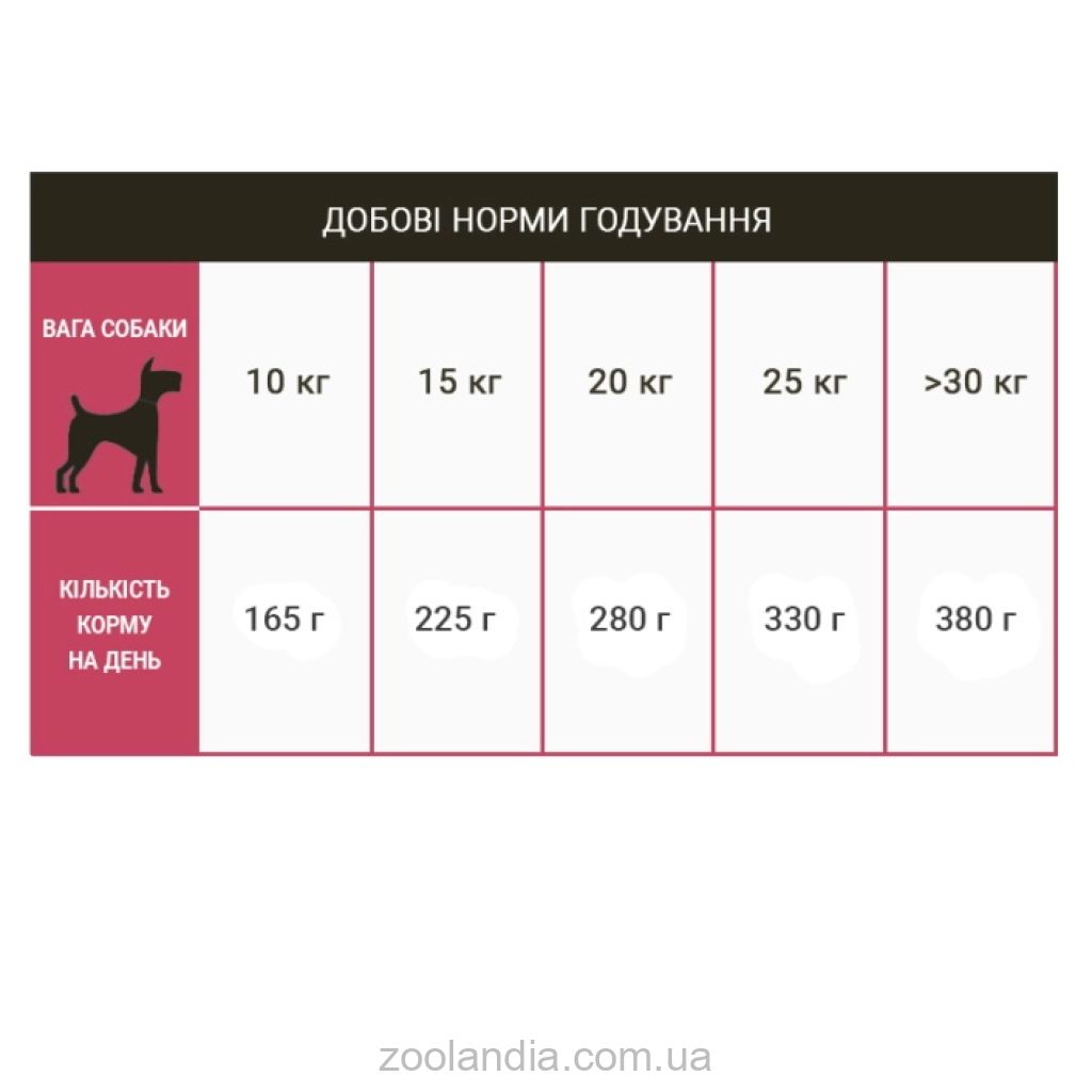 Повністю задовольняє потреби собак у харчуванні та допомагає їм залишатися здоровими й активними. Мінімізує ризики появи харчової алергії, оскільки не містить барвників і консервантів, містить тільки 1 джерело легкозасвоюваного білка тваринного походження і джерела жиру високого ступеня очищення.