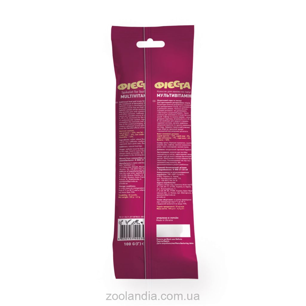 Склад: просо, овес голозерний, насіння льону, ріпак, рис, сафлор, насіння соняшнику, сушена морква.