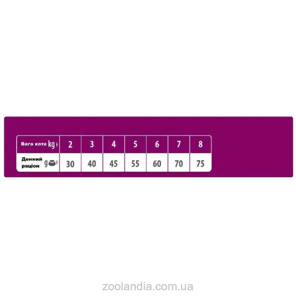 Харчові додатки на кг: вітамін А 27500 МО, вітамін D3 1200 МО, вітамін Е 510 мг, біотин 1мг, таурин 2000 мг, пентагідрат міді (II) 33 мг (мідь 8,8 мг), сульфат заліза (II) моногідрат 260 мг (залізо 86 мг) , йодид калію 1,9 мг (йод 1,4 мг), селеніт натрію 0,2 мг (селен 0,1 мг), цинк сульфат моногідрат 405 мг (цинк 148 мг), сульфат марганцю моногідрат 123 мг (марганець 40 мг). Зоотехнічні добавки: амоній хлорид 5 г.Зоотехнічні добавки: амоній хлорид 4 г.Енергетична цінність: 3775 ккал/кг.Аналітичний склад: сирий протеїн 35%, сирий жир 12%, сира клітковина 4%, сира зола 7%, Омега -3 0,9%, Омега - 6 2,5%.